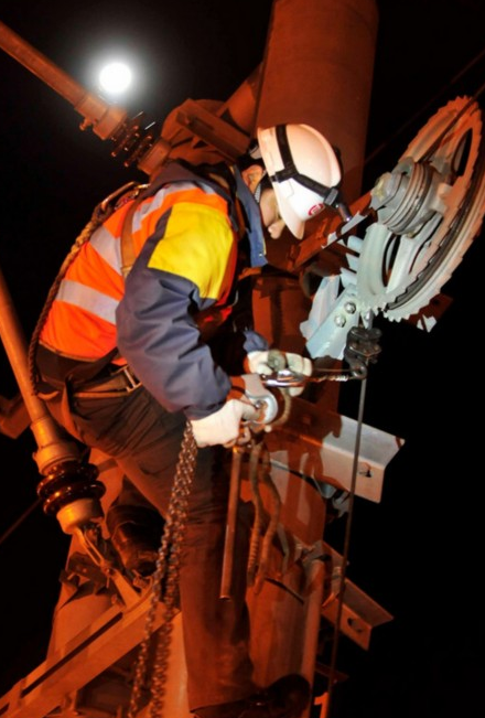 圖中,我們可以看出,天已經(jīng)完全黑了下來(lái),劉師傅還在10米的高空中,使用手扳葫蘆對(duì)重達(dá)400公斤的墜砣進(jìn)行調(diào)整,可謂是十分辛苦。但是為了保障我們生活中的電力,他們只能這樣做,真的是謝謝他們啦。